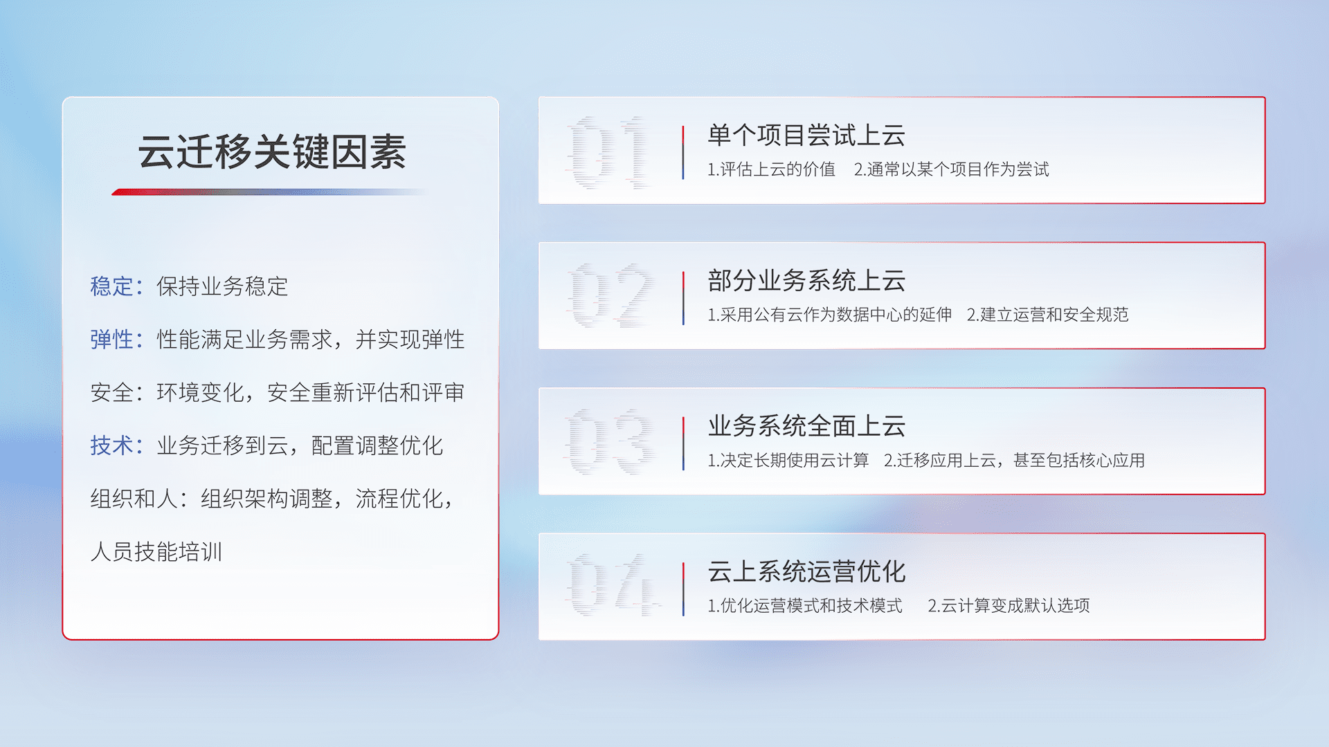 结合实际业务,,,,从规划设计、、、云平台选型、、、、云原生改造、、、数据迁移、、、集成交付,,迁移全过程为客户识别最佳上云路径,,,,做好风险识别管理,,,设计网络架构、、身份权限、、、安全审计合规、、、操作审计、、、、日志审计、、、、监控告警策略、、、多站点容灾设计等,,,,对云上基础设施进行整体规划,,,,提升IT治理水平,,以满足弹性、、、高可用、、、、高性能的需求。。