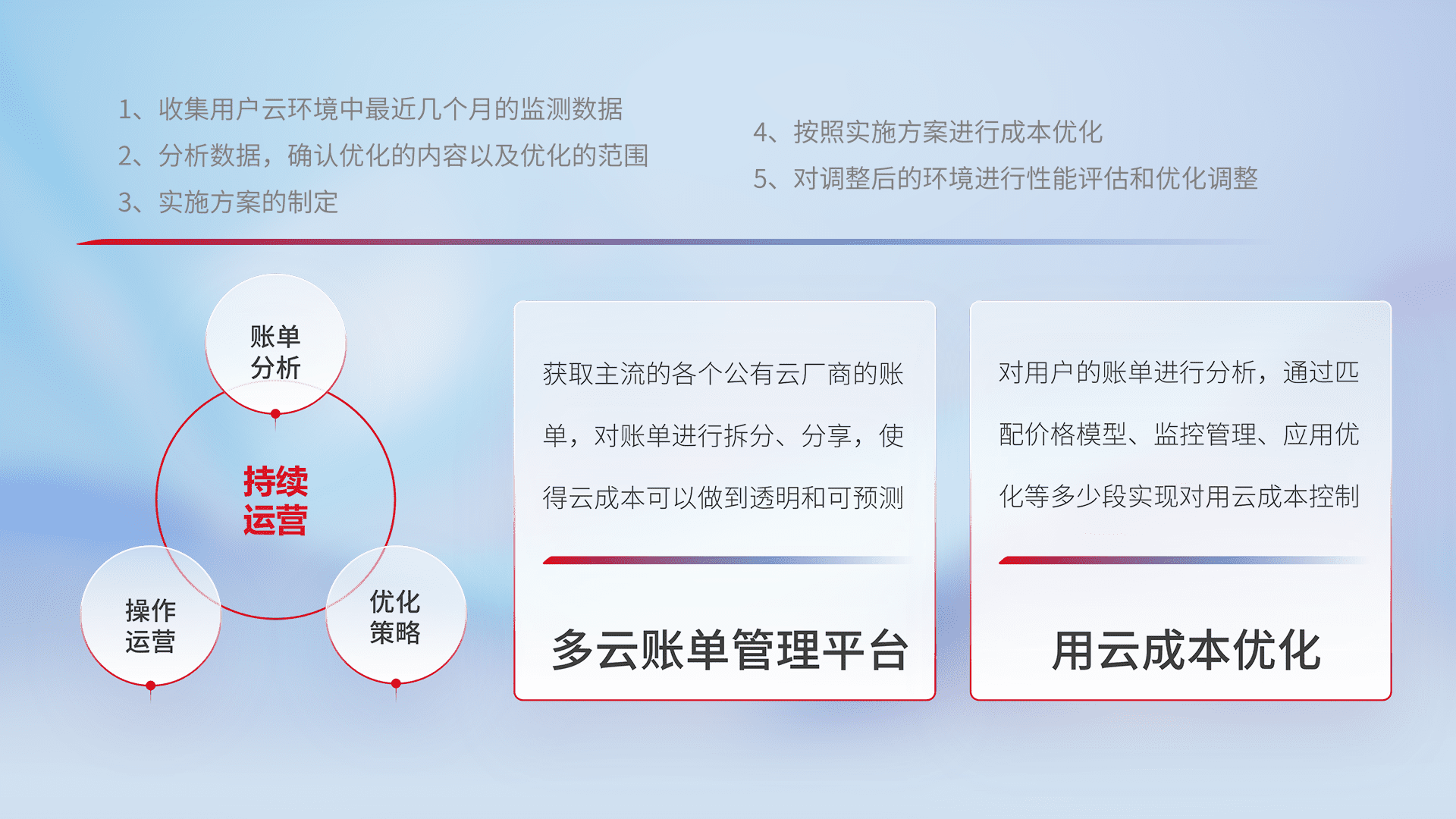 通过多云纳管,,,以统一的资源数据模型把客户的云资源进行抽象和封装,,,进而实现对多云资源的统一操作,,保障云资源管理的可靠性、、、、稳定性与可用性。。。。量身定制化运维内容,,,配置、、、、开发运维、、、补丁管理、、、、备份、、、监控、、、认证和访问管理、、、、审计和日常巡检等,,,保障在用云过程中的可靠度,,,,稳定度以及高可用率。。。